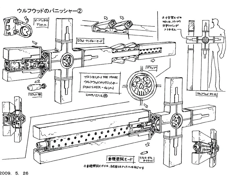 После долгих размышлений, решили отталкиваться от патрона. В Тригане упор делается на западные виды вооружения, изредка японские (Калашников в аниме не в счёт, он базировался только у одной банды). К тому же промышленность Гансмоука вполне позволяет производить свои варианты. Но прототипами-то всё-равно служат земные экземпляры! В общем, в указанный промежуток попадает крупнокалиберный патрон 12,7×81 мм. В пользу этой гипотезы идёт тот факт, что этот патрон был п