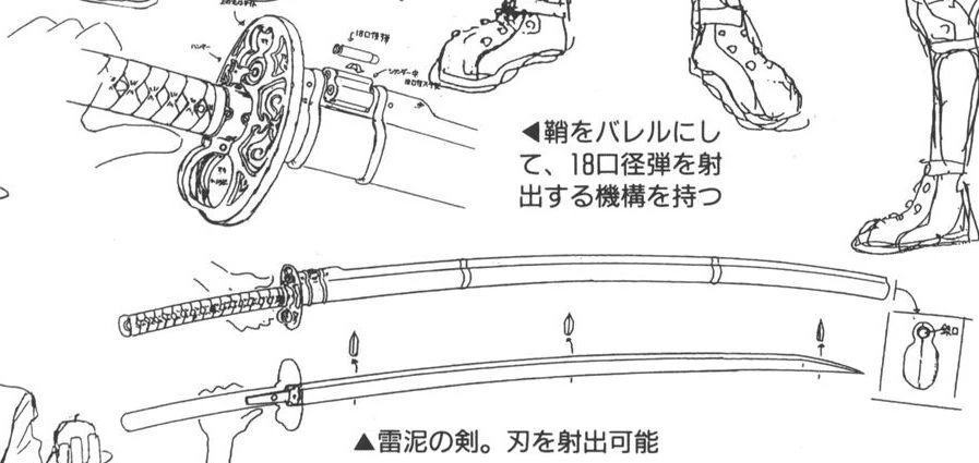 Отрывок из Артбука Триган где подробным указанием показана оболочка катаны Рай-Дэя и его цилиндр.