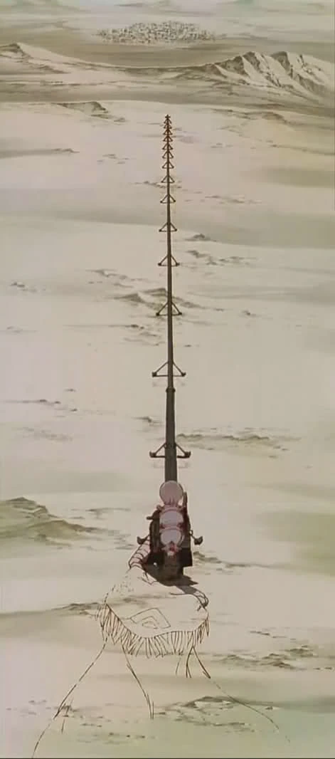 Caine walks through the desert carrying his rifle. He stops many miles outside Tonim, places his rifle and opens fire on the town aiming to Vash.
