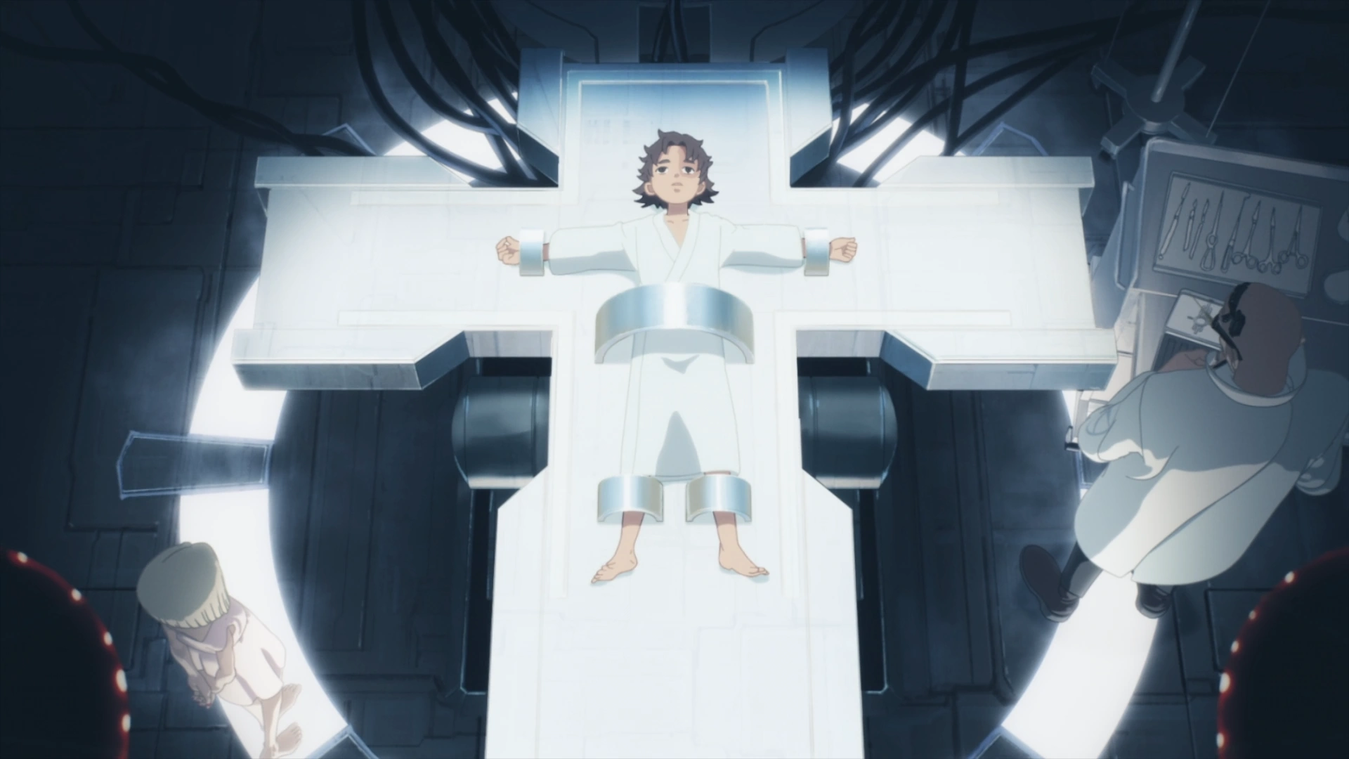 At night, Rollo goes into the large windmill. He finds William, Elendira and several Eye of Michael members inside of it. He wonders if they are God, but William tells him, "The man you praise as God is not here right now." The Eye of Michael members then sedate Rollo, which causes him to drop his lamp and start a fire. Rollo wonders if Elendira is a sacrifice too, but she laughs at the idea and states she is an "angel". Rollo is taken by William, who injects him with a drug to rebuild and strengthen his body. He claims that if Rollo adapts to it, it will cure his illness. As Rollo starts transforming, he yells for Vash to help him. Rollo turns into the large man and William puts an implant in his brain to heighten his emotions, particularly anger, and leading to accelerated development of athletic abilities. He's the first subject to survive in five years and William is happy. Rollo later returns home to his mother, but she considers him a monster, which causes him to go wild.