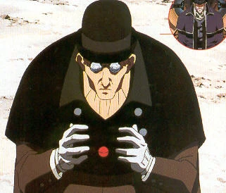 The anime does not feature his background, and he is simply a puppet-controlling assassin. He created a puppet during Hang Fire in order to locate Vash the Stampede and was soon sent along with Gray the Ninelives and Hoppered the Gauntlet in the attack on Vash's home. He is killed by a rocket fired by Nicholas D. Wolfwood.