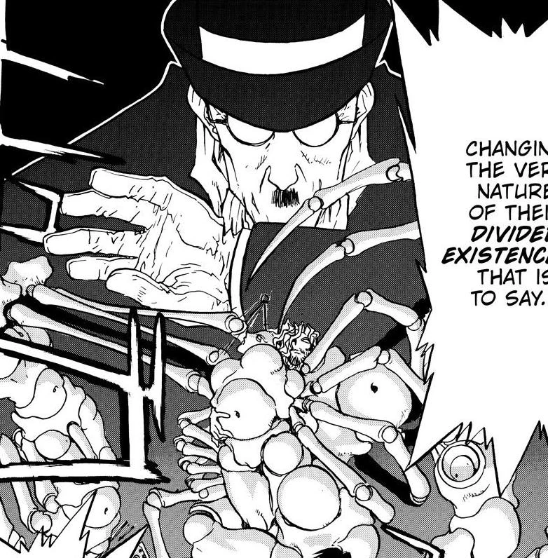 Leonof the puppeteer is an old man who uses puppets as weapons. He controls these puppets with an elaborate string system over 10km long and thin enough to be nearly invisible, as well as in combination with special spheres that can form subtle illusions to further conceal his strings and make his puppets even more realistic. He can make his puppets look like practically anything, including birds, insects, bats, little monsters, humans, and he can even combine the body parts of his puppets to form giant monsters. Some puppets even have built-in guns. Leonof has been shown to control hundreds of puppets simultaneously and over considerable distances, making him quite questionable as to what his limits may be. Leonof is normally quite reserved, letting his puppets usually speak for him.
