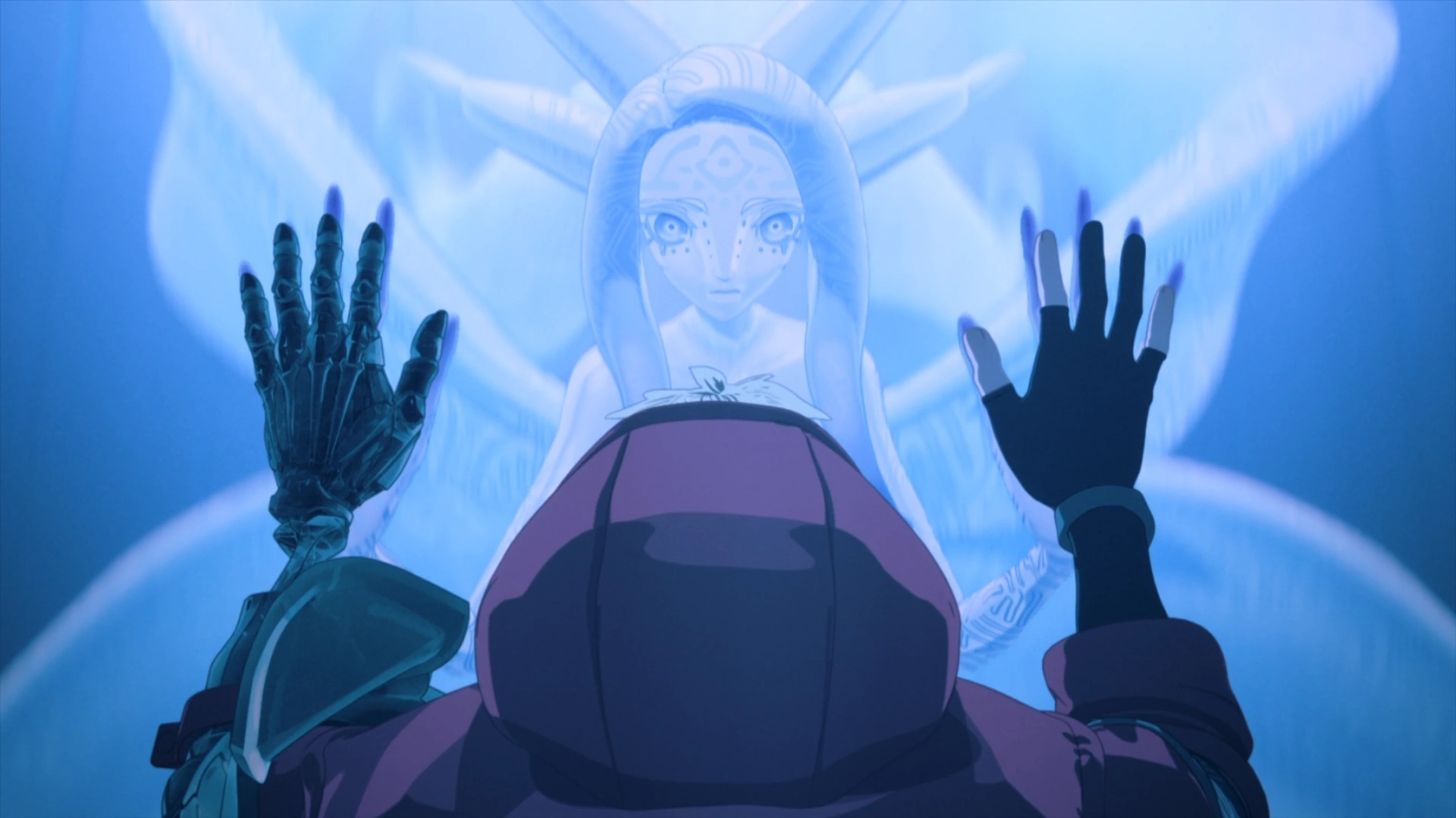 Meryl, Roberto and Wolfwood then find Vash in the plant room, where his body is covered in a pattern just like the plant.