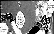 Zazie the Beast is actually a legion of insects that were the original inhabitants of planet Gunsmoke. The first other being they ever saw was Knives, who interested them greatly. It is unknown how they became members of the Gung Ho Guns, but from what they said through their hosts, they at first had hoped to live harmoniously with humans and plants, but they eventually decided they'd be more inclined to living with plants likes Knives.